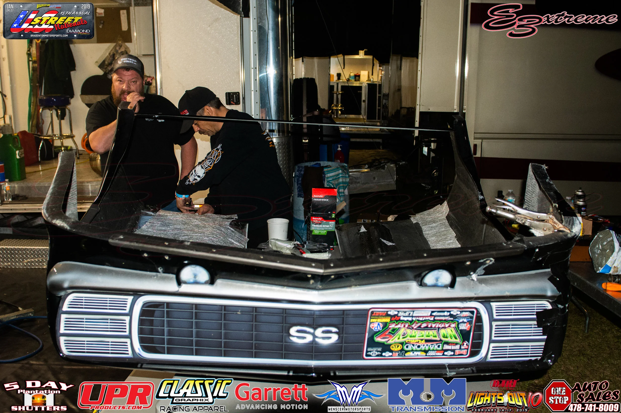 I headed back to the pit area later to check on Paolo, and what I found was a crew busting their butt getting everything back together for him to make it into eliminations. His crew guys were hard at work on the front clip with fiberglass and resin to fix some damage, while Paolo had the welder in hand to touch up a bracket rod. Shocked would be an understatement in describing my thoughts when I saw how minimal the damages were to the car. I thought there would be all types of damages, and as you can see, there was very little. In my opinion it was one of the best saves I have seen.