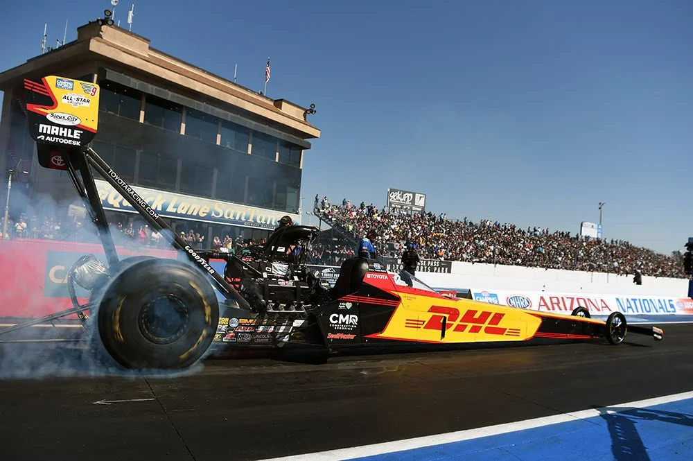 Shawn Langdon and the DHL Kalitta Air Toyota Top Fuel dragster raced to the quarterfinals today at the NHRA Arizona Nationals. The 2013 NHRA Top Fuel champion stepped up every round of qualifying and moved into race day as the No. 7 qualifier. His best time of the weekend going into eliminations was a solid 3.696 second pass.